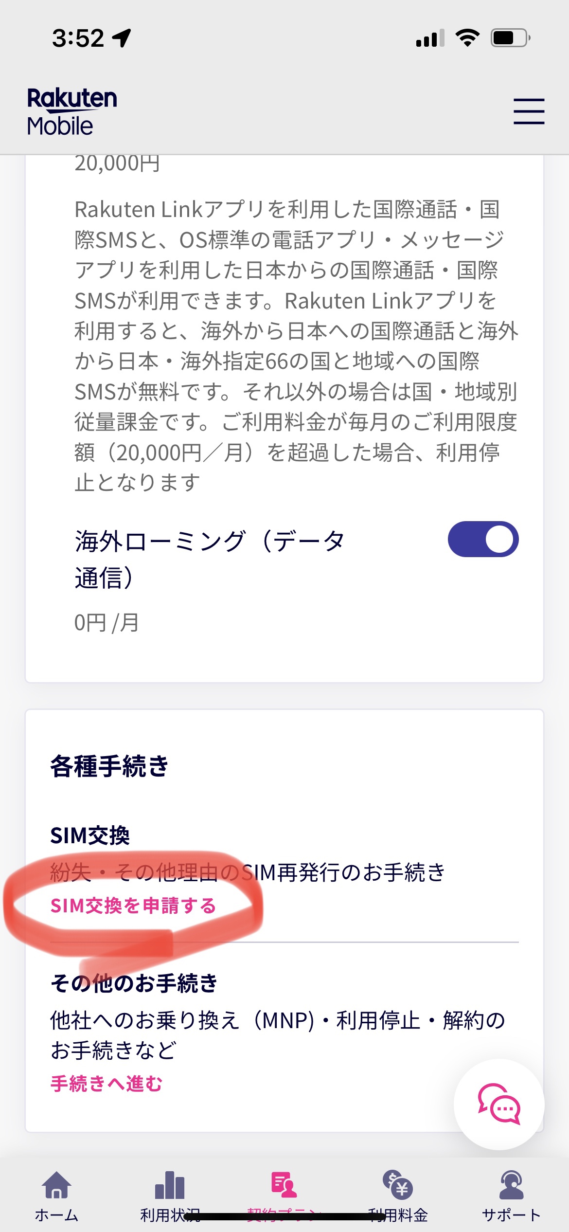 Rakutenのアプリから開通手続きへ進む。「my 楽天モバイル」のアプリで行ってます。