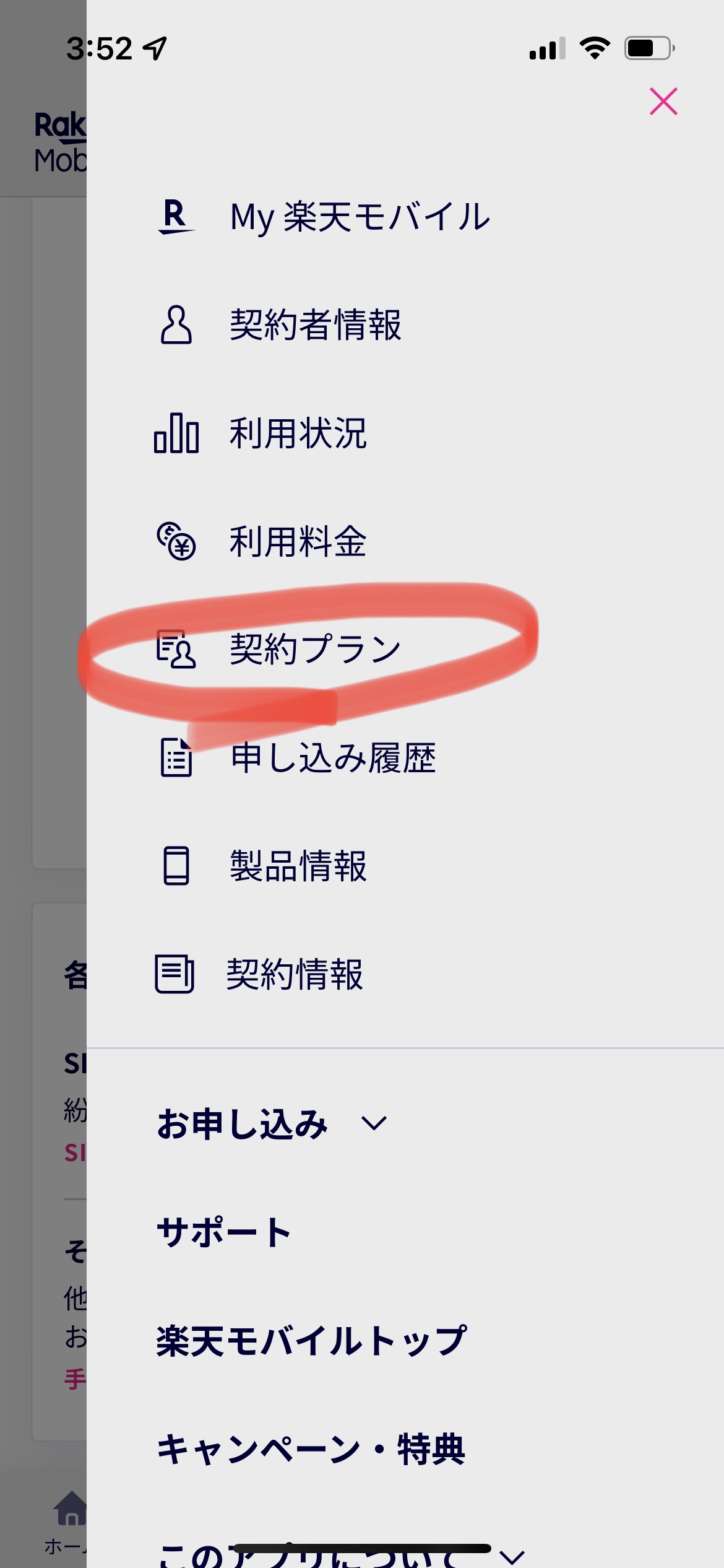 楽天モバイルにログインして右上の方にあるメニューを開く。