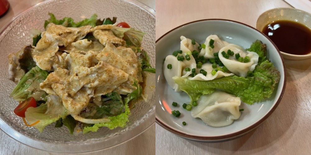 冷しゃぶサラダ630円と水餃子450円を注文。水とお茶がセルフサービスでテーブル席があるエリアの定員がいるカウンターの横に設置されていた。