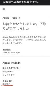 返金処理のメールきた。Apple下取。満額8000円。自己申請は8000円を指定していた。ディスプレイ部分にはガラスフィルムを貼ってたので綺麗だったと思います。角と背面は細かい剥がれや傷はあった。