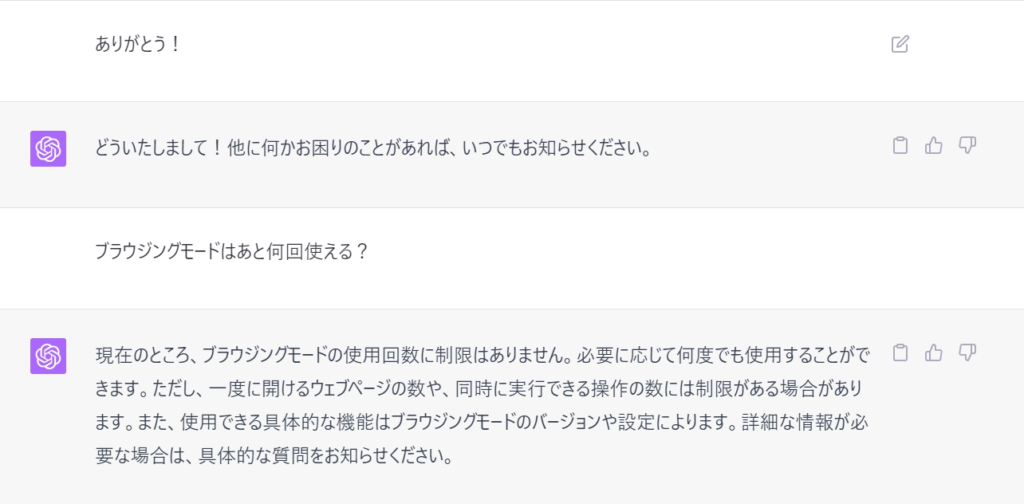 ブラウジングモードでの会話は全てブラウジングする訳ではなさそうです。ブラウジングしたチャットにはGPTのアイコンの横にドロップボックスが表示されます。