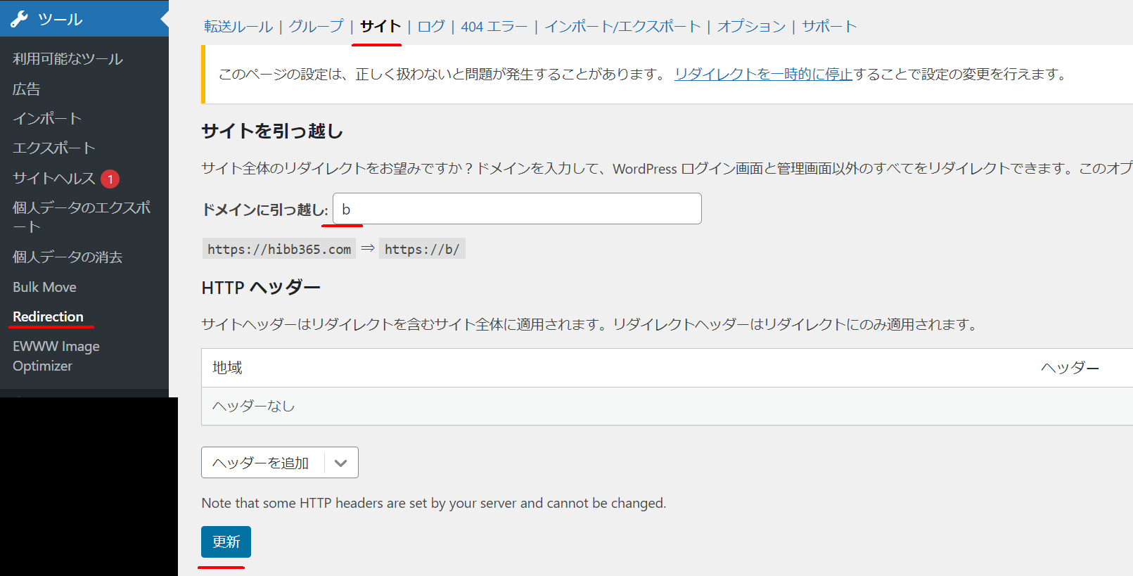 サイト全体を飛ばす場合はRedirectionページの「サイト」項目のところで設定を行う。