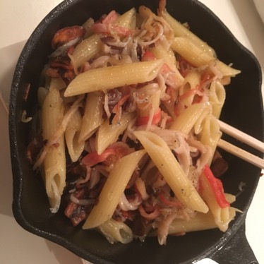 きのことパスタ。オリーブオイルでエリンギいためてゆでたパスタを入れるだけ。