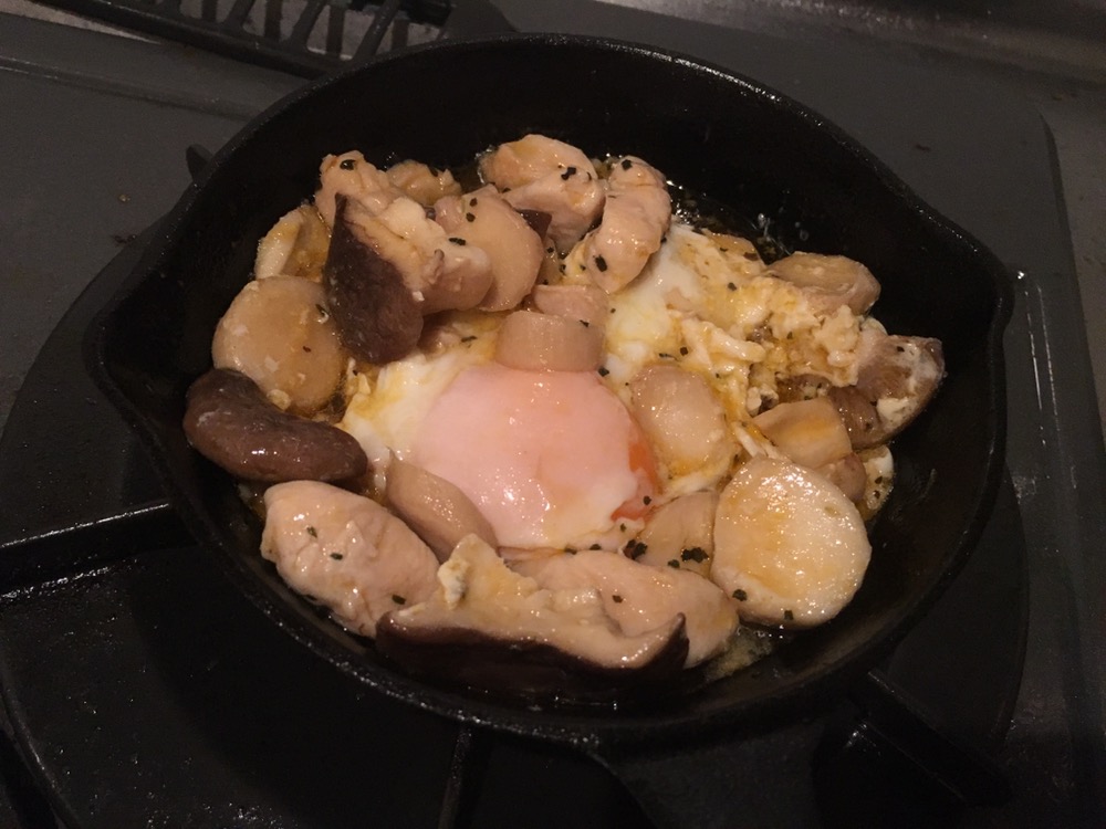 鶏むねとエリンギとたまご。オリーブオイルでじっくり煮るといい感じ。