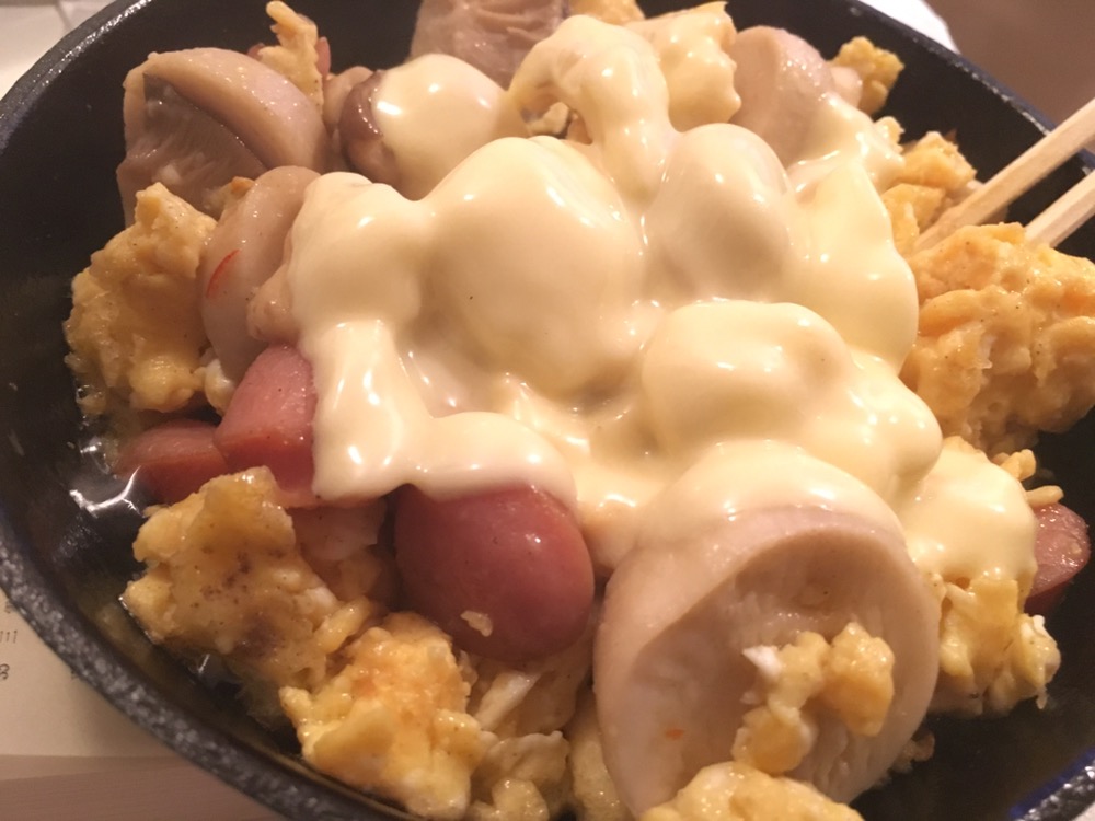 ウィンナー、エリンギ、スクランブルエッグとチーズ。おなか減ってたんです!