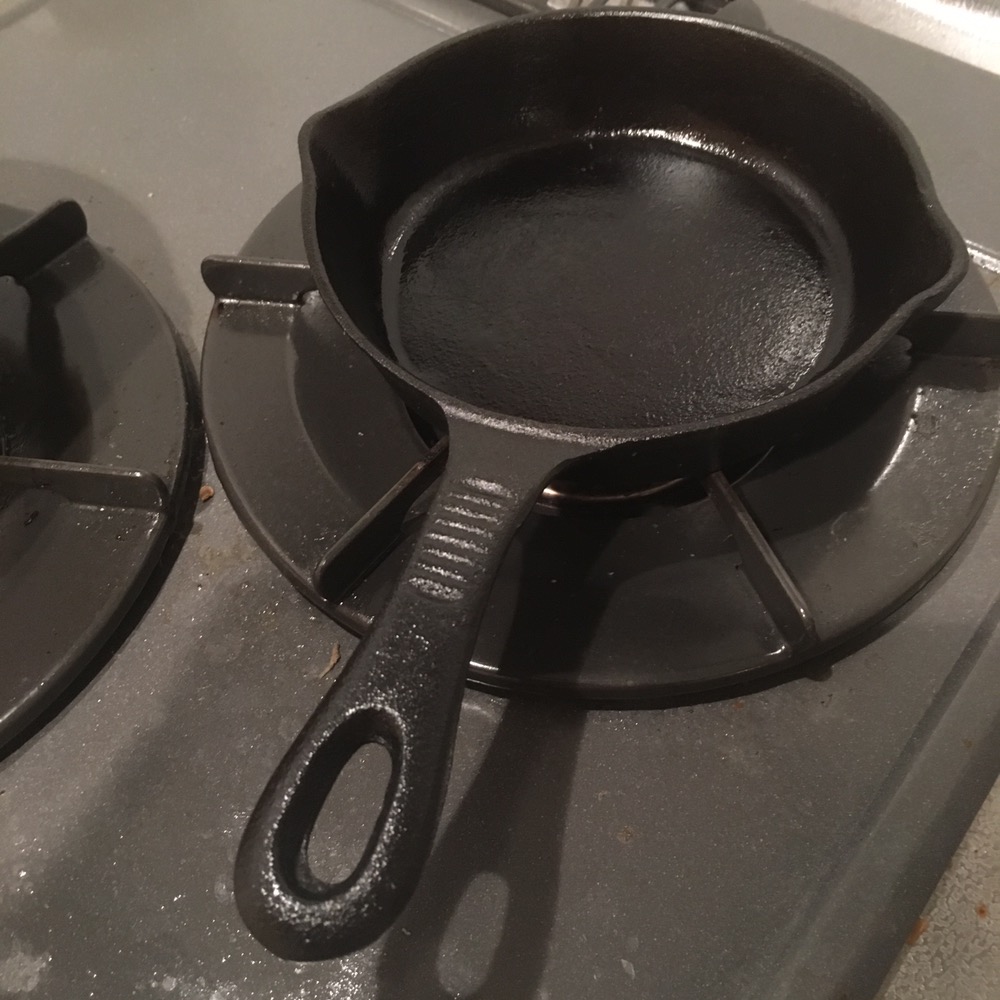 鉄製のキッチンツールは使い始めに油でコーティングをします。 コーティングをしないとすぐに錆びついて使えなくなってしまいます。 このコーティング作業をシーズニングと呼びます。 高めの商品だとシーズニングされているものもあります。 買ってきたときに少してかっていたのでもしかしてすでにシーズニングしてある!? と思ったのですがシーズニングしたらさらにてかりましたのでやってなかった気がします。 かなり安いかったですし・・・。 ↓シーズニングしたスキレット↓洗って、オリーブオイル塗って、キッチンペーターで伸ばして、焼いて、洗って・・・と三回くらい繰り返しました。 火が当たる裏面や取っ手もコーティングしました。 本当はクズ野菜などを炒めたりして香りをつけるといいみたいですが今回はやりませんでした。