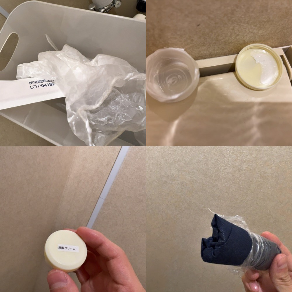 ちゃんと巻いておかないと下着やズボンにクリームが付いて汚れてしまう。左右の太ももをそれぞれ巻く感じにして股間部分もなるべく巻き込む。横から腰に巻くようにもして漏れがないようにする。なるべく切らずに繋げて巻く。