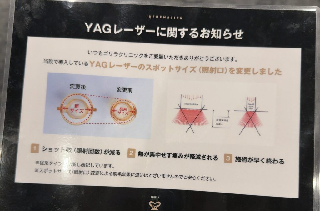 ヤグレーザーの照射の仕方が変わったようだ。範囲が広くなりより深い部分まで届くようになるようだ。