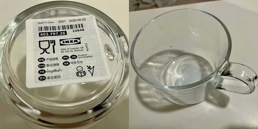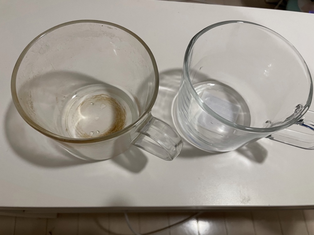 IKEAのクリアマグカップを数年使用したビフォーアフターの写真。3~4年以上は使ってたかと思います。