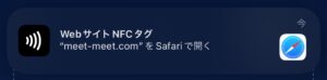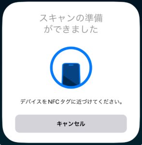 するとスキャン準備が整うのでNFCタブ(MEET)に近づけます。iPhoneだと真ん中ではなくてカメラとかがある上の方ですね。