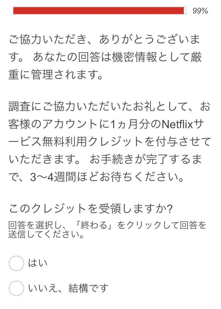 このアンケート自体はNetflixの利用頻度が落ちきてたなど一定の条件を満たすと送られて来るのだろうか? もしくはたまたまのランダムだったのだろうか。。。