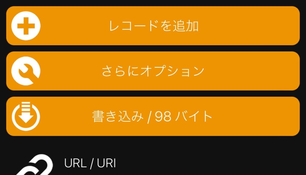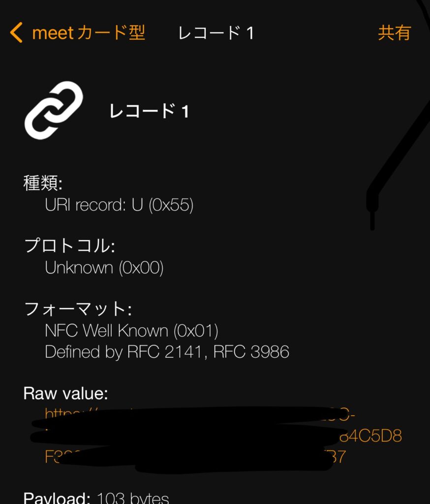 このアプリを使ってmeetのカードNFC情報を読み込んでみた。URLが表示されていのでこれをコピーして書き込んでみる。(後で詳しく書くが、カード内臓情報のURLだと上手くいかなった。qrコードの方の URLじゃないと正しく機能しない)