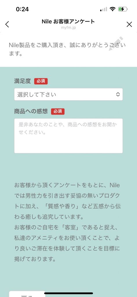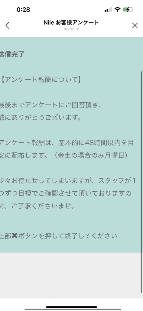 アンケートは選択式じゃなくて直接入力しないとダメなら物が多かったので少し面倒。しかし量自体は多く無いのですぐ終わると思う。5分かからないくらい。