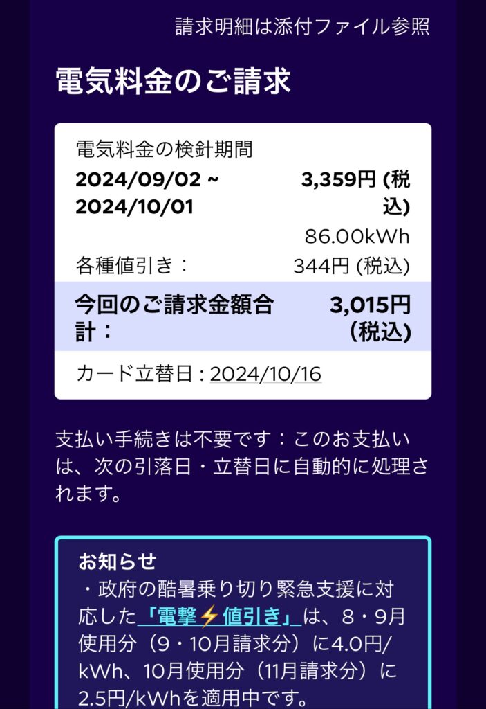 無事切り替わって電気が供給されている。料金が確定するとメールが来るようで料金も書かれている。料金が書かれていなくて、ネットへログインしてPDF確認しないとダメなところもあるこで料金書かれているのは助かる。