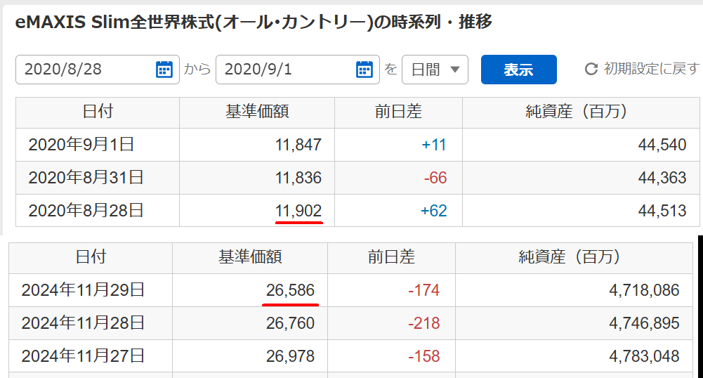 オルカンの2020年8月28日時点での基準額が「11,902」、2024年11月29日は「26,586」です。(2024/12/1は日曜日なので2日前の金曜日のもの)