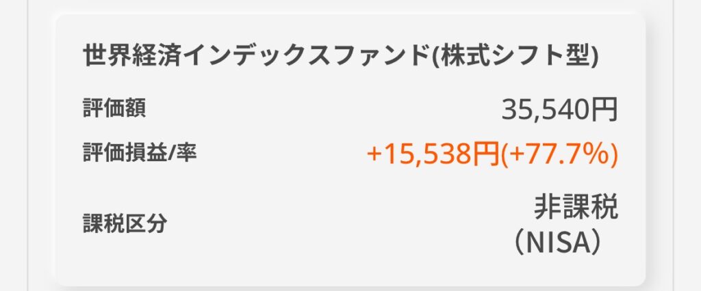 世界経済インデックスファンド(株式シフト型)に約4年間投資したリターンは「77.7%」でした。