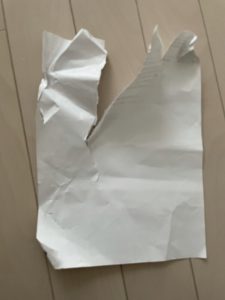 B5くらいのサイズの紙。地面に置いておいたら巻き込まれて破けていた。いらないやつだったから問題無いけど大切な書類とかが落ちてて巻き込まれると大変そう。