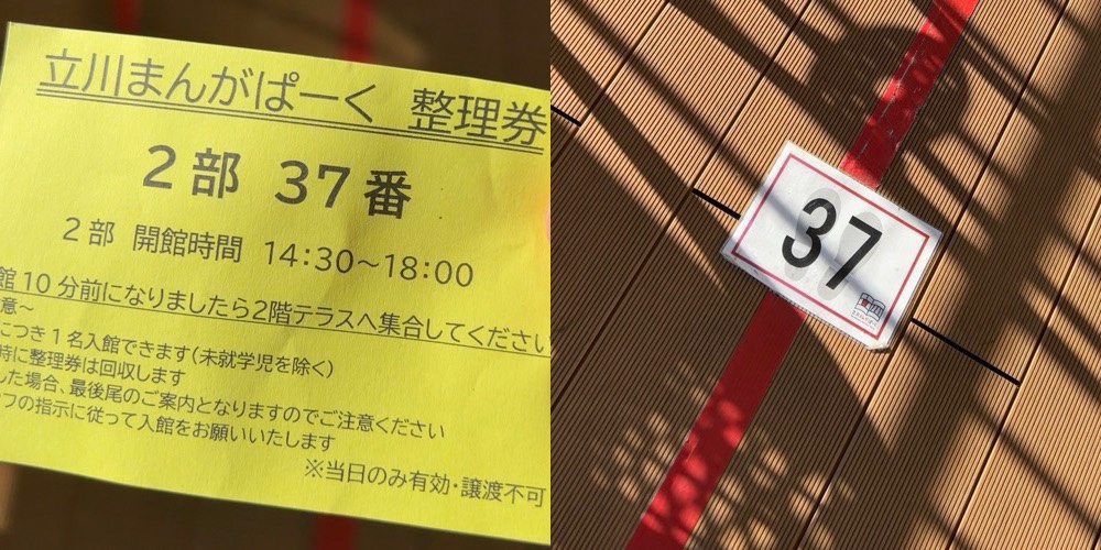 外のテラスには足元に番号が貼ってあって最初は自分の整理券番号と同じ番号のところへ並ぶ。前が入場していくので間隔を保ったまま前に進んでいく。