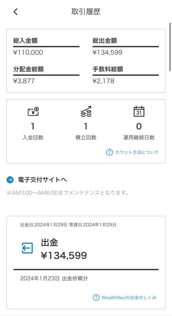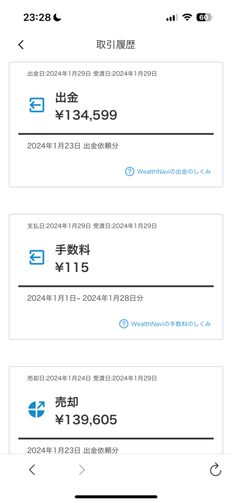 出金依頼してから売却するようで、実際に口座に残っていたのは139,490円。そこから4,891円の税金が引かれたようです。