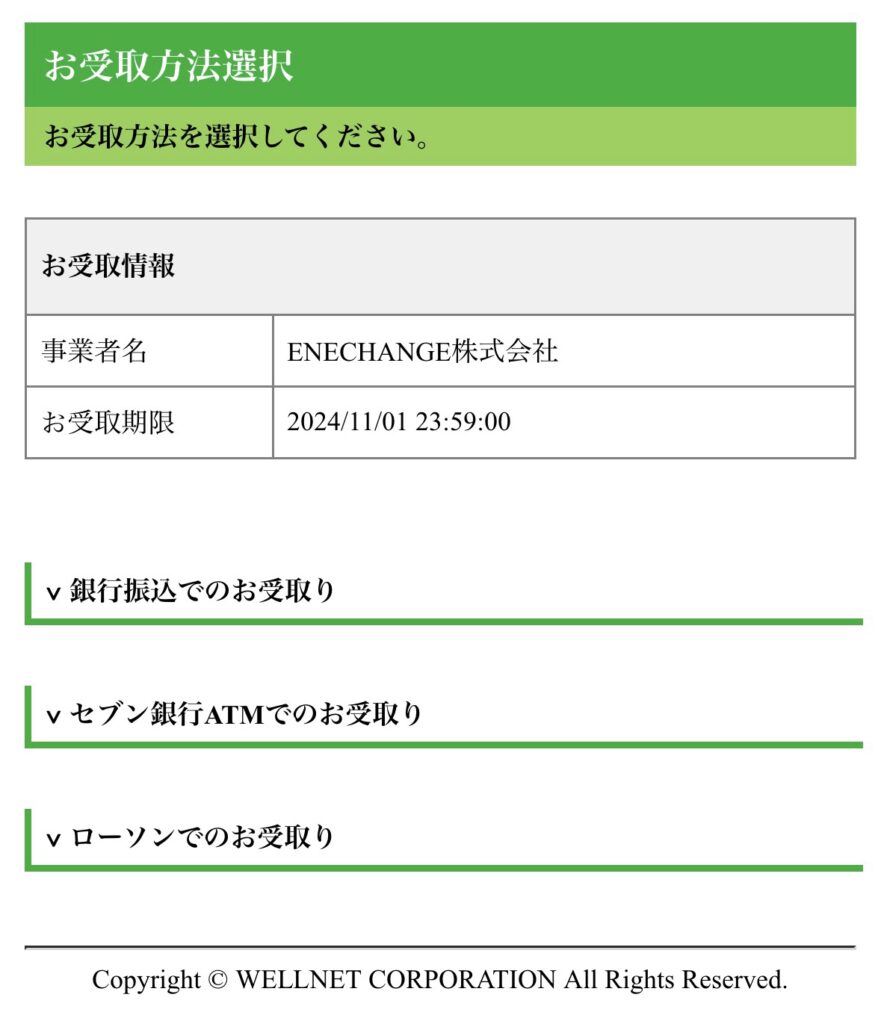 ログインするとキャッシュバック方法が選択できるので、登録します。銀行振込の他にセブンとローソンで受け取ることが出来るようです。