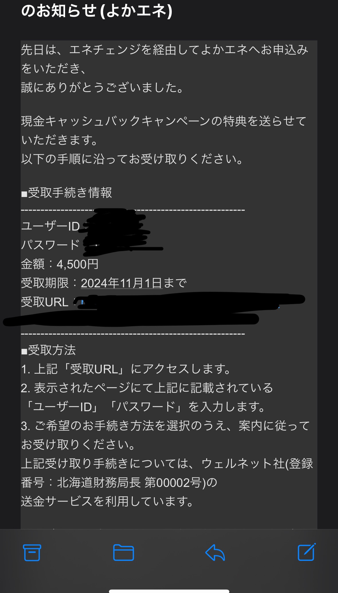 エネチェンジ経由でよかエネに乗り換えて13ヶ月くらい経った、2024年8月1日にキャッシュバックのメールが来ていた。